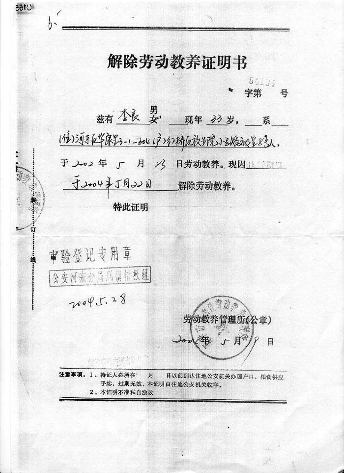 担惊受怕中迎来了春节,他们的大女儿在春节期间又被剥夺了自由,除了“她坚持炼法轮功”之外,没有任何理由。一纸劳教书,就是一个人的几年时光啊!