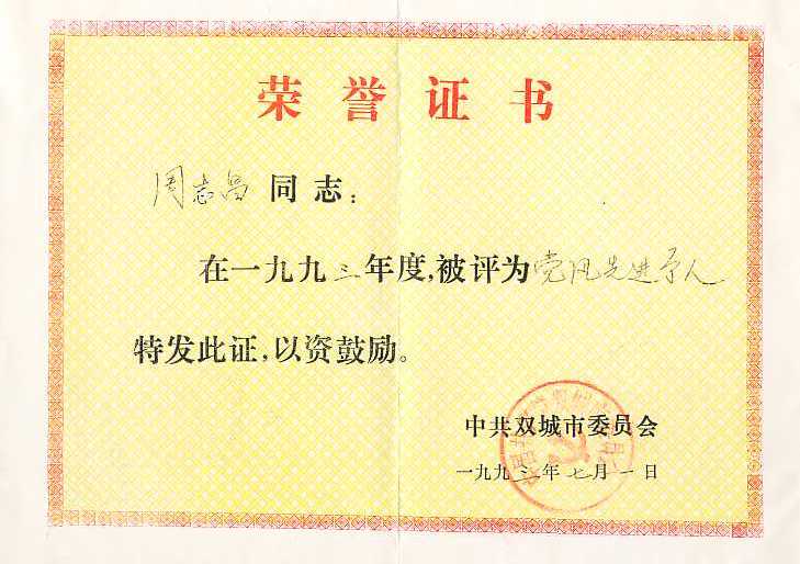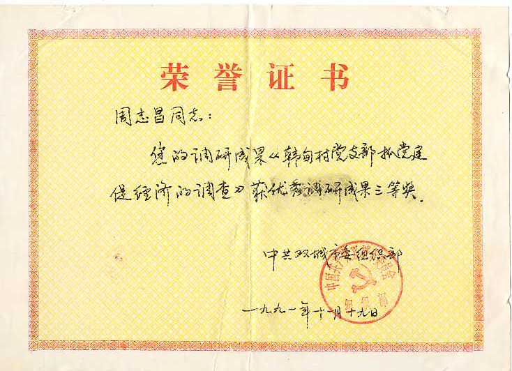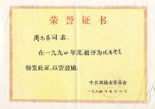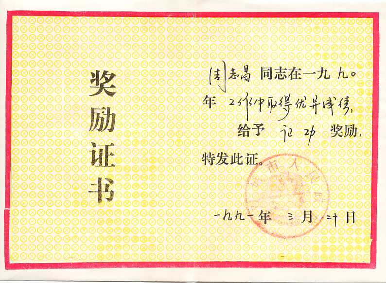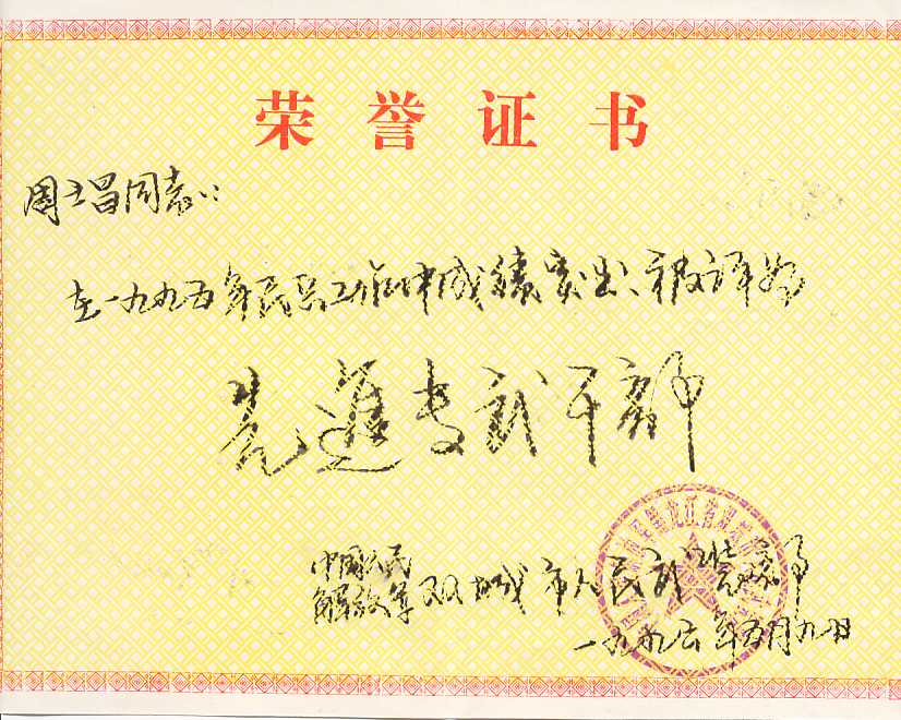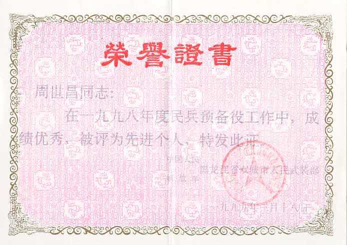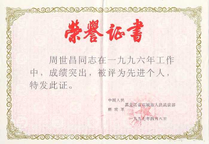 黑龙江双城市韩甸镇人武部部长周志昌从1995年9月份得法开始修炼法轮功,曾担任双城市法轮功辅导站负责人和韩甸镇法轮功辅导站的负责人。周志昌为政清廉,不谋私利,是韩甸镇远近闻名的好干部。提起周志昌,韩甸的老百姓都挑大拇指:“好人!”他在单位获得的各种荣誉证书有几十本。下面是大法弟子周志昌生前获得的部分荣誉证书。
