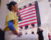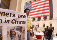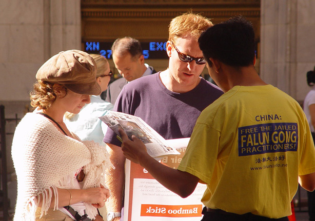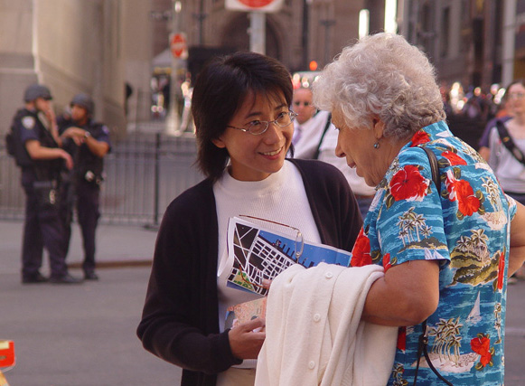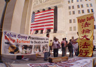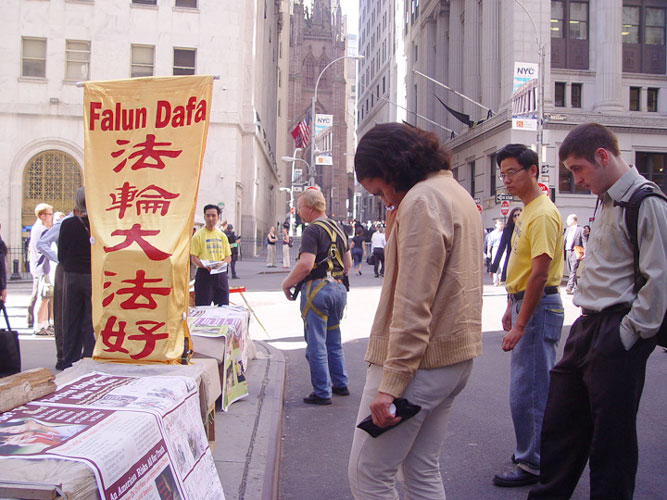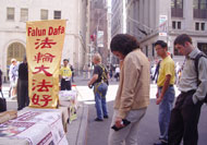 ![]() “请了解一下法轮功的真象吧。” | ![]() 一位年轻的女学员在华尔街打坐炼功 | ![]() 股票交易所前的图片展 |