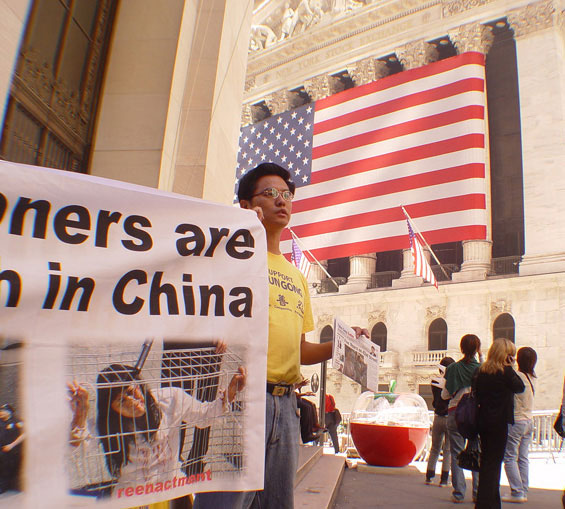 纽约股票交易所,这里的每一起落沉浮都牵动着世界的经济命脉,在当今恐怖分子威胁袭击的阴影下,中秋的华尔街11号更成了世界上最令人神经紧张的地点之一。然而就在戒备森严的交易所大楼对面却是一派祥和的景象,一群来自美国西海岸的法轮功学员平静的展示着法轮功的五套功法,并将法轮功无辜在中国被迫害的真象介绍给经过的每一位交易人、警察和路人。