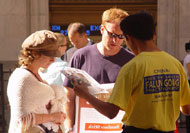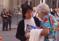 一位上点年纪的妇人问我这里在发生什么,我指着图片跟她讲,她非常认真的拉着我说:看着我的眼睛,告诉我。我意识到她怕听的不清楚,本来我英语讲得也不太好。我静下来,一字一字的告诉她,在中国好人因为炼功、修“真善忍”被打压五年多了。明白后,她说(迫害)真是太不好了,她要我给她四张传单。告诉我说她是英语老师,教中国人学英语,下次她就要和她的中国学生讨论法轮功的问题。一位在场的同修听了后想起那些不接受真象的中国同胞,忍不住说了句,看来要“出口转内销才行”。