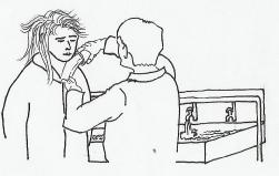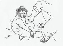 马增友又拿出警棍在我头上身上乱打乱捅,甚至动手动脚耍流氓,他企图把手伸到我的上衣里摸我胸,他从我脖领处死拽着我的胸衣带子不放手,我拼命挣扎不让其得逞,累的他没有力气了,他才放弃。后来進来一个警察带我出去了。没多长时间,马增友又把我带回二楼他的屋子里,進行了新一轮更残酷的折磨。还是先打脸,打了一阵子,他用双手做爪状使劲抠住我双眼,邪恶的说:“我把你眼睛挖出来!”又捏住我双耳,来回乱扯,仿佛要扯下来,之后是嘴唇,同样是撕来撕去都出了血,恨不得从脸上拽下来,然后又是打脸……他逞凶时是怕曝光的,时不时看看门窗,怕有人经过发现他的邪恶行径。我明白他的心虚后大喊起来,他害怕极了,马上用擦脚毛巾堵住我的嘴,我吐出来,他就将臭脚往我嘴里伸。如下图示: