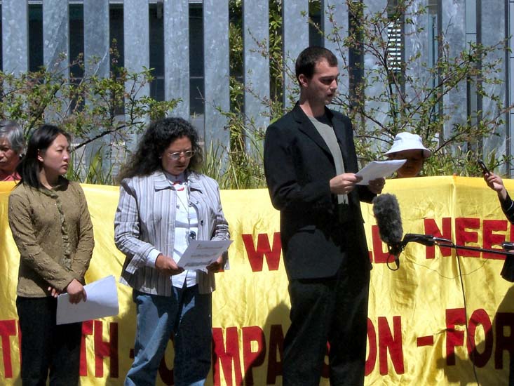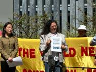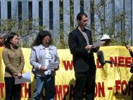 ![]() 横幅 | ![]() 悉尼法轮功发言人David发言,左一为李迎 |