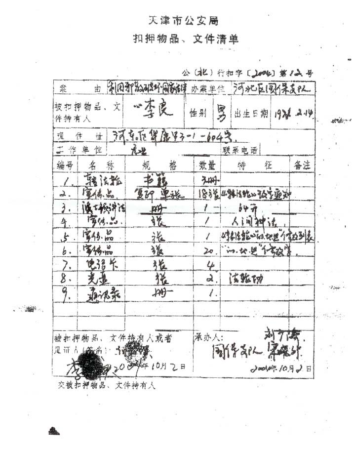 李迎讲述了弟弟在中国被绑架的具体情况。李良是在10月2日下午3点前失踪的,涉案警察为天津河北区公安分局国保支队的宋晓升(或宋晓生)和刘广涛。他们跨区来到李良的户籍所在地,由河东区和平村派出所的户籍警耿涛、陈青、和居委会的刘玉英配合,当着李良年迈父母的面抄了家,搜走了3本《转法轮》、其他法轮大法资料和1本通讯录。居委会的刘玉英作为抄家见证人,在“天津市公安局扣押物品、文件清单”上签了字,国保支队刘广涛、宋晓升在“承办人”一栏签了字。