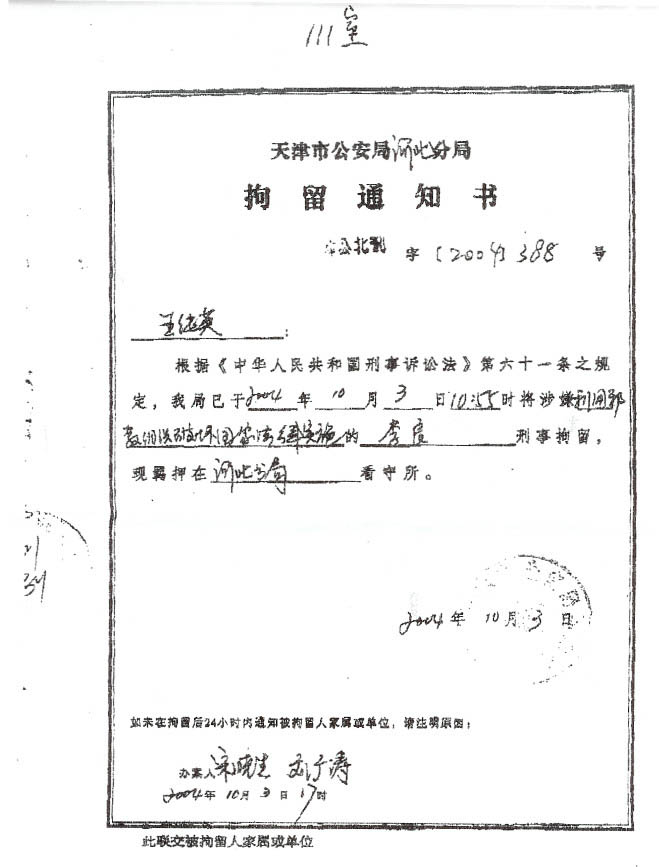 10月3日下午北京时间四、五点钟左右,李妈妈去天津市河北区望海楼派出所要人,警察刘世伟、杨建两人称拘留证已经办好,正好要给她送去,并极力解释关押时间是从10月3日早晨10:55开始计算,并未违反抓人后要在24小时通知家人的规定。而实际上李良是在前一天下午3点前就被抓走了。这两位警察要求李妈妈在拘留证上签字,否则不允许第二天给李良送衣物。考虑到北方的天气越来越冷,李良没有足够的衣服,李妈妈签了字。