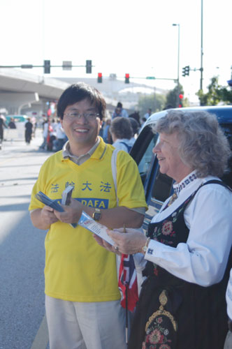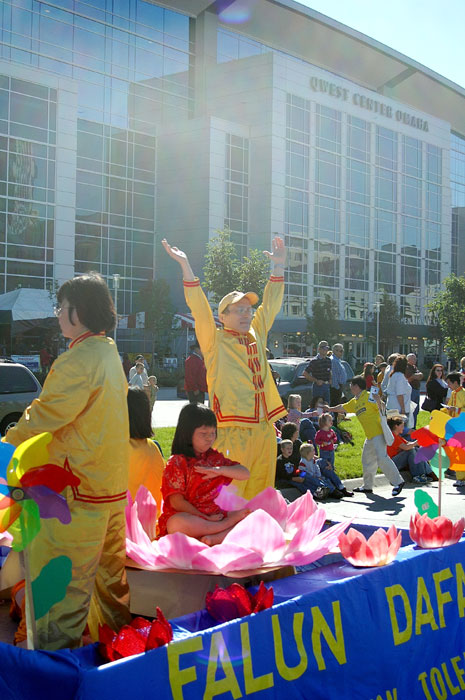 【明慧网2004年10月9日】二零零四年九月二十五日,美国内布拉斯加州及附近的部分法轮功学员参加了一年一度在内布拉斯加州奥马哈市举行的“沿河城市牛仔节大游行”。漂亮的彩车,端坐在莲花中可爱的法轮功小弟子,舒展优美的功法表演,不时赢得人们的阵阵喝彩,很多观众都问询法轮大法介绍材料,很多天真可爱的孩子希望得到洪法书签。