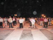 来自全省各县市共千名法轮功学员集体炼功,整齐、祥和的场更是当天节目的另一震撼。天音合唱团演出有女高音张佳慧助阵,把“法轮大法好”赞美诗的天籁之音在强劲的澎湖东北季风中传扬开来,由澎湖同修组成的飞天舞蹈团及台中小弟子的神韵舞蹈团演出都获得不少掌声。