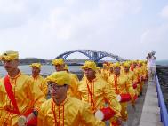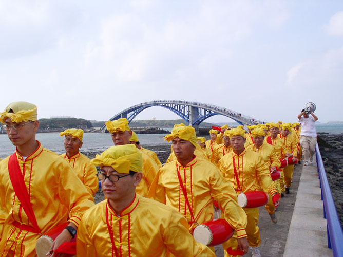 三日上午在观音亭的马拉松赛配合演出中,法轮大法学员提供了五个节目,约占总节目的一半。法轮大法学员组成的神威腰鼓队引领民众走西瀛虹桥(拱形铁桥水泥路面)。澎湖地方报称这是当天表演团体中,两支最有看头的队伍之一,吸引了全场民众的目光。