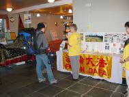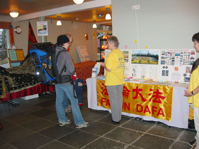 11月6日早晨,几名芬兰法轮功学员开始了洪法讲真象活动。学员们在一楼展销厅租了一个摊位,摆放法轮大法介绍资料及揭露中共江氏集团酷刑迫害法轮功学员的展板,并向人们演示功法,面对面讲真象、教功。一位学员身穿着醒目的金色炼功服,在门厅演示功法。在饭店的免费早餐时间,三个学员在餐厅演示功法。法轮大法的炼功音乐回荡在整个饭店。