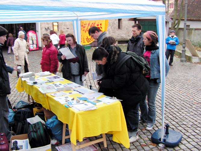 让人感动的是一位中国小伙子在看那些图片时专注的眼神,他简直无法相信法轮功学员真的遭受到这样残暴的酷刑。后来他又回来呆了一会儿,看来他的心一定是真的被感动了。