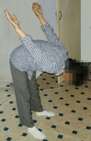 在恶警赵余庆的规定下,法轮功学员每天早晨5点起床就得坐在小塑料凳上,双手放在膝盖上,双脚并拢,不让动(除了吃饭、定时上厕所)。2003年12月,十几个学员坐到晚六点后被强迫蹲着,蹲到晚8、9点,副队长杨国红看着学员蹲姿,双脚蹲在一块30x30cm的地砖上,不准超出砖外,脚后跟靠拢,蹲着不准低头,身体不准动。有的学员蹲不下,双脚跟落不到地上,脚尖支撑着身体,非常痛苦,造成双脚、腿、胯麻痛,后背、颈酸痛(经常强迫学员蹲、有的学员蹲十八、九个小时,最长的蹲2─3天),如坚持不住或蹲姿不对,姚福昌就用大电棍电或吊起来上大挂。