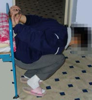 就这样,有个学员被强行关在禁闭室八个多月(其间只出来两天),在小号期间,不准家属接见,不准买任何吃的东西,八个月只洗过一次澡,吃的不如猪狗,有时还不给吃饱。由于长期的打骂、恐吓、体罚、折磨,使这个学员出现了严重的高血压、心脏病(医生说心脏肥大)症状,从小号出来后,开始站立不能超过五分钟,否则就感觉心脏承受不住,有时头象爆炸一样疼,经常头晕,全身浮肿。
