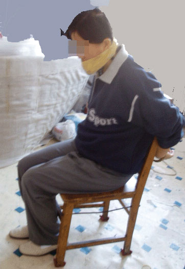 5月27日,我看到恶警刘春刚让李兰坐到小号的地中间去,李兰拒绝,他咣当一下打开铁门,双手握拳,左右开弓打李兰的脸,不知打了多少下,累的他直喘,然后用绳子把李兰捆绑起来扔到小号外大屋的水泥地上,并说:“看一会我怎么收拾你。”他出去办事回来后,把李兰塞到刑椅上(刑椅全部由铁制成,扣在上面后,双腿双脚及身体都不能动,双手用手铐子铐上,有时铐在前边,有时铐在后背),后来又把李兰挂到小号的门上。