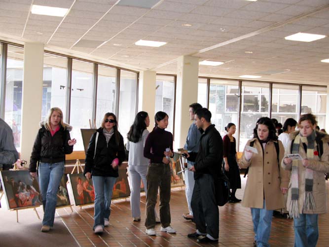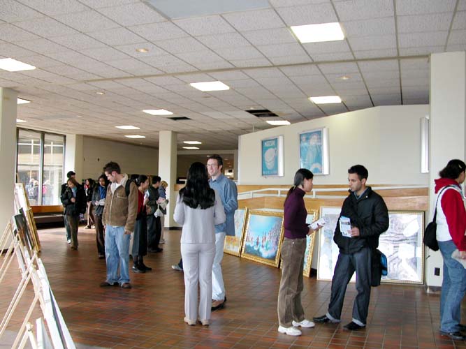 这次的画展,看的人很多。很多学生和教授都来看了画展。他们都从不理解迫害的始末到后来签了很多支持诉江的明信片。当地的人们很善良,他们对发生在中国的迫害情况很关心。很多人和法轮功学员们聊了很长时间。有5-6 家媒体来采访,都作了比较深入的了解。最初,很多媒体只把画展当成一个纪念性的画展,而没有想到迫害的严重性和它是正在发生的事实。与学员交谈过后,他们都停留下来,并做了详细的记录和采访。