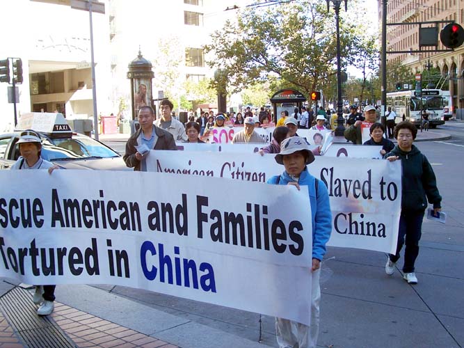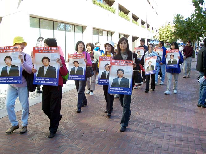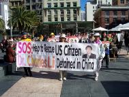 中午12点,湾区的法轮功学员和参加活动的人们首先从旧金山的贾斯汀-荷曼广场游行到市中心的联合广场,呼吁社会各界关注法轮功学员在中国受到的迫害,帮助营救法轮功学员和家属。他们举着“还法轮功学员在中国的自由”,“帮助营救美国公民李祥春”等各式横幅穿过繁华的旧金山。游行吸引了许多路人的关注。