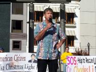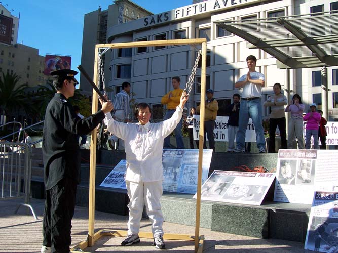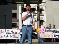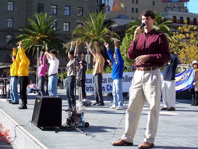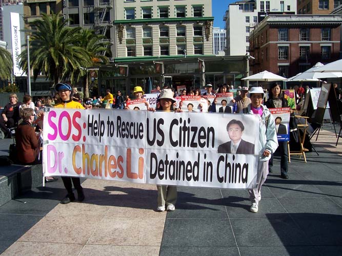 游行结束后,在联合广场举行了集会。旧金山湾区法轮功发言人张雪容博士说,李祥春医生2003年1月去中国告诉中国人民关于法轮功的真象,却在广州机场遭到逮捕。现在李祥春已经被江氏集团非法关押快两年了。在这近两年的时间里,南京监狱对李祥春采取的是肉体与精神迫害并施的手段,肉体上采取了野蛮的强制灌食、体罚和被逼迫在有毒环境下超负荷劳动;精神上则采取强制洗脑逼迫李祥春放弃对法轮功的信仰。我们要求中国政府立即无条件释放李祥春。