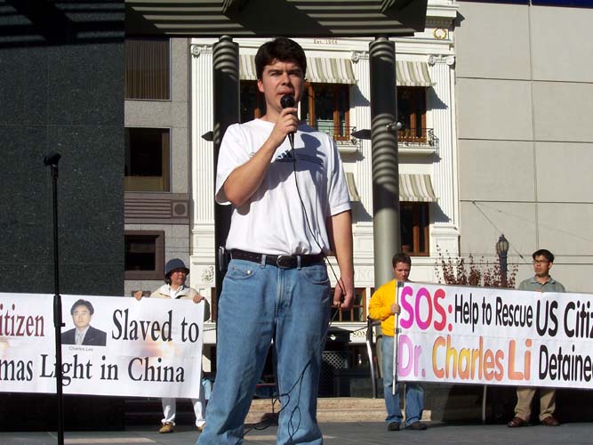 大赦国际的代表杰弗里(Jeffrey Shirtleft)说,我非常高兴代表大赦国际在这里发言,非常高兴大赦国际能和法轮功在一起。我是查尔斯-李的朋友,我不是法轮功学员。但是我非常敬佩法轮功。我代表大赦国际,也代表查尔斯的朋友,向北京当局呼吁,立即停止迫害!立即释放查尔斯-李!