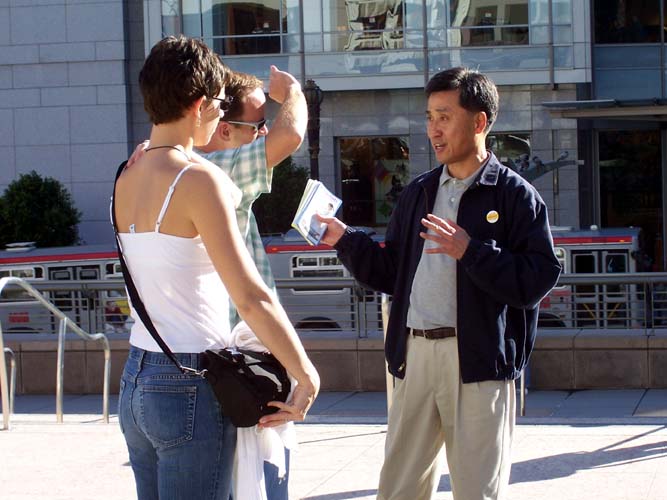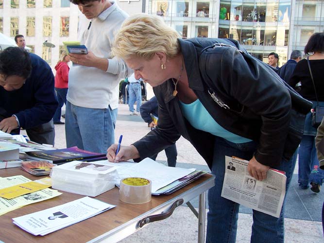 当天,很多路人在集会现场聆听发言并在营救查尔斯的签名簿上签名。一位在集会现场聆听发言的Kim表示,以前就听到法轮功学员受迫害的事。但是整天都忙忙碌碌的,没有时间坐下来冷静的思考这件事。他说,“今天我在这里可以好好的了解这件事,了解查尔斯被捕的事,看看我可以做些什么来支持他的获释。我非常乐意帮助营救查尔斯。”接着,他骄傲的在营救李祥春的签名簿上签了字。他说,“每个人都有信仰自由的权利。”