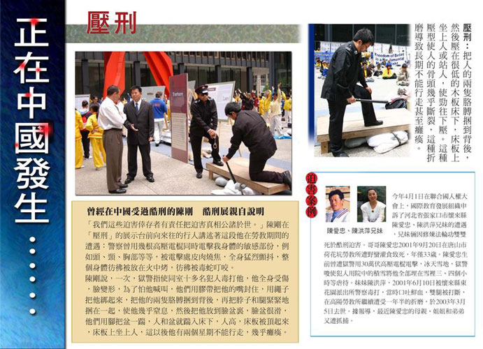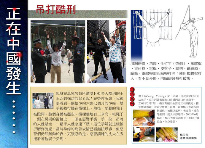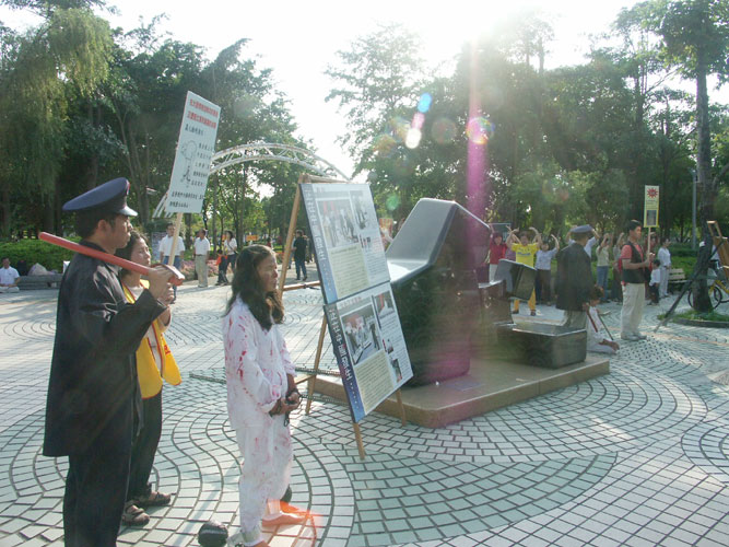 一进大安森林公园,人们即被这惨烈的场面所震惊,一幅幅酷刑展板,诉说着法轮功修炼者为坚持真理而承受巨大苦难的故事。