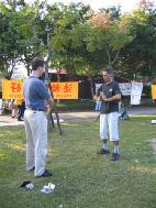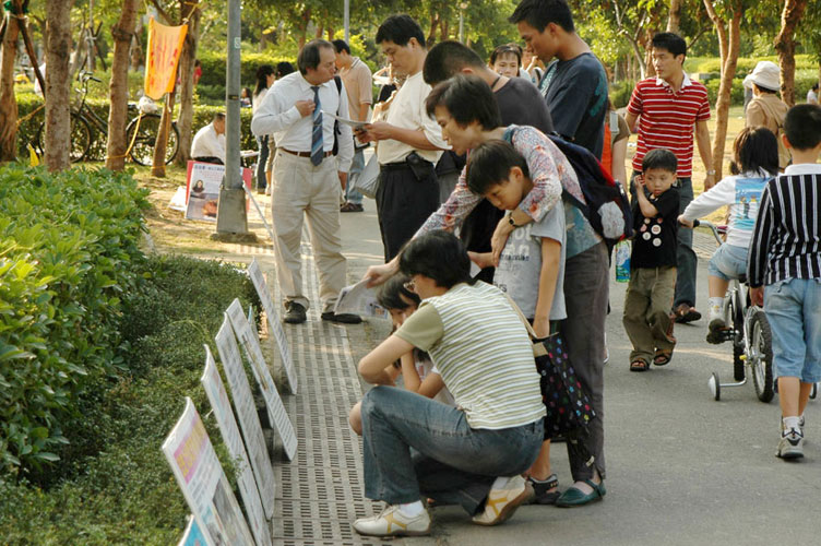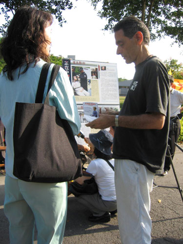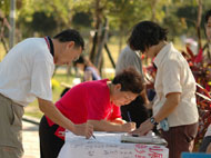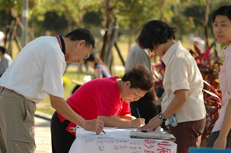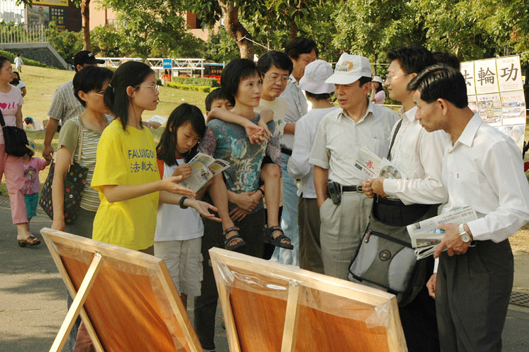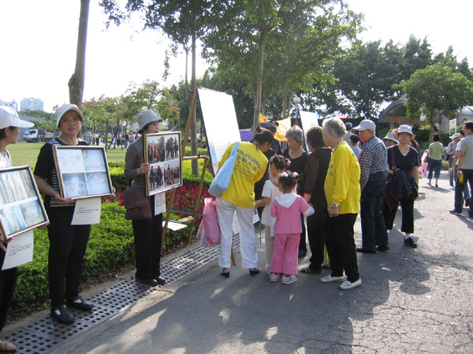 一位在带着小孩到旁边游乐场玩的妈妈,很好奇的问“只是炼炼功就要受到这么残酷的迫害?”旁边已了解真象的一位年轻小姐马上指着一幅八个月小孩和她的妈妈被迫害的照片说,“你看,他们连一个小婴孩都不放过,他们还有什么做不出来?”那位妈妈看着远处在玩沙的一群小孩,轻轻的叹了一口气,在呼吁停止迫害的白布条上签下了她的名字。
