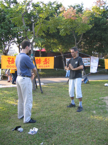 一位美国法轮功学员带着朋友来参加这酷刑展,他一边解说着现仍在中国发生的残酷迫害手段,一边指着法轮功学员的演出说,还有许多酷刑是无法真人表演的,因将危害到生命。这位友人说,他的台湾法轮功朋友怎么跟他说他都不相信,今天亲眼目睹这场表演终于相信了,随即还表示这功法这么好,他一定要学。