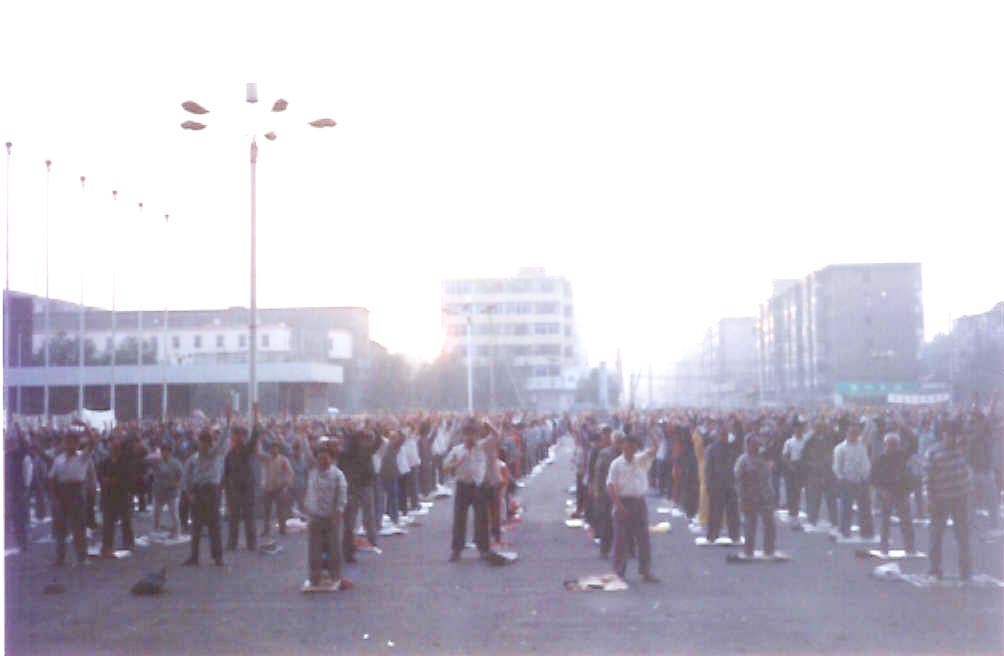 历史图片:1999年5月双城市大法弟子在东门广场集体炼功