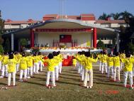 晨曦中,和煦阳光照耀在运动场上,祥和的炼功音乐伴随着学员们动作优美、整齐画一的功法表演,让全校师生们感受到这宁静慈悲的场,并赢得热烈掌声。
