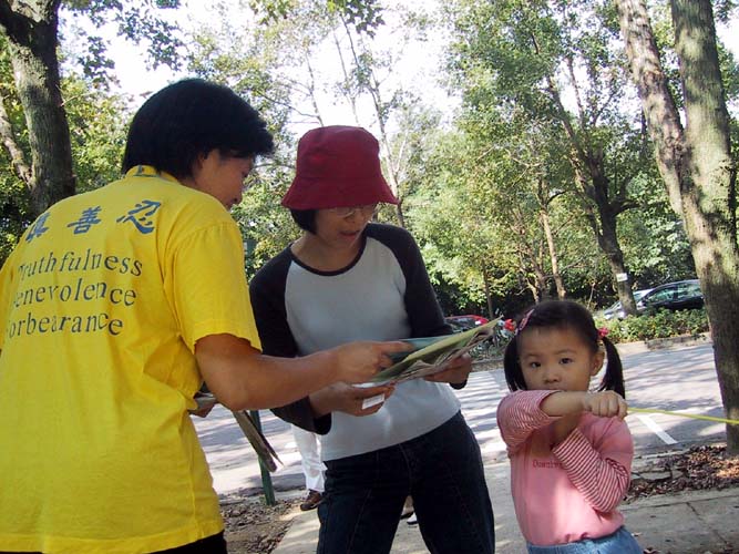还有一位妈妈,在看到真象资料中内地打压学员的酷刑,表示不解和谴责。经过和学员的交流后,还表示想学法轮功,当他们知道小朋友也能学法轮功时,乐意的接受了学员赠送的光碟片(内容包括各中小学和大学学生学炼法轮功后身心受益的故事。),并表示要让她的小孩儿跟着学。在她明白为什么要看《转法轮》一书时,对法轮功重视修心性感到非常的赞同。