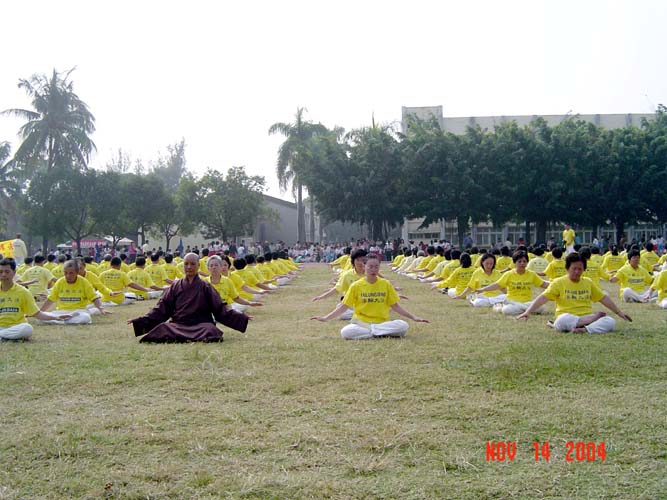 法轮功学员受邀参加此次运动会,在运动会现场演示五套简单易学的功法并介绍法轮功如何有益身心升华。在学员祥和的演示五套功法带动下,司令台上的刘校长及各家长委员当场学炼。