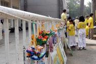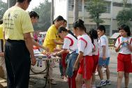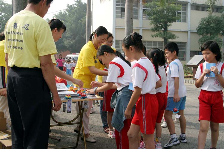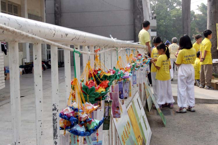 法轮功学员也提供自制的纸莲花,赠与来往的师生及民众,尤其是天真无邪的小朋友,纷纷前来探寻,学员并叮咛小朋友要记住“法轮大法好”,小朋友也回应着微笑点头,更相继大声说出“法轮大法好”,并带走相关资料回家要给爸妈看,现场的祥和气氛,感染了每一个人。