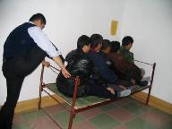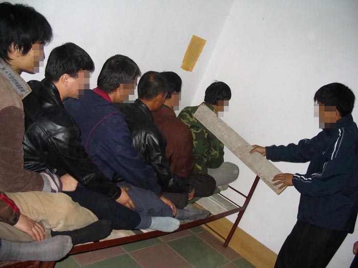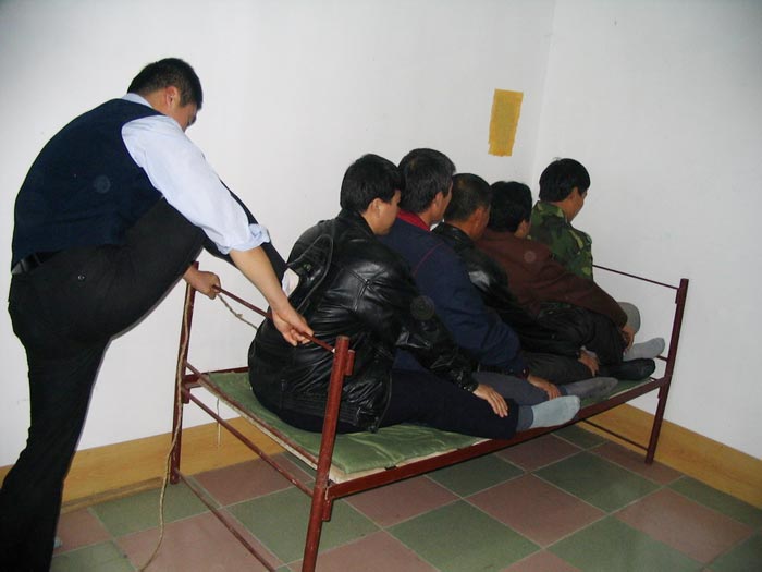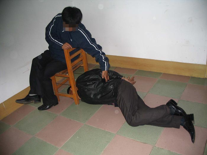 2001年11月吉林市欢喜岭劳教所法轮功专管队,我们几个不写保证的大法弟子排成一行,双腿盘上后用脚踹紧,然后用木板固定,一动不能动,韩晶说谁动往晕了打,臀部坐烂了,内裤贴在臀部,上厕所就扒一层皮,血一下就流到腿弯处,每天最长坐22小时。(图6、图7、图8)