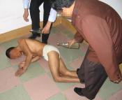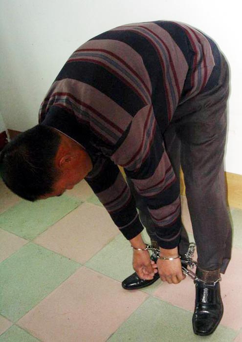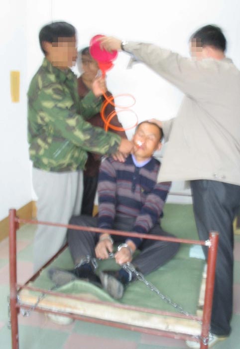 2001年2月6日,我被非法关進吉林市第一看守所001管区2号。十多平米的监室关着20多人,有好几个杀人犯已经成了变态狂,管教叫王仲让刑事犯叫我读诋毁大法的报纸;我不从,他们就打,然后把我扒光衣服抬進厕所,两大桶冰冷的凉水用小盆一点一点的浇在头芯上(图5),天气预报当天是零下42度。监室内水用光了,几个犯人把我象五马分尸一样,穿着鞋踩在脚上来回转,致使后来脚内侧溃疡,脚肿的象馒头。