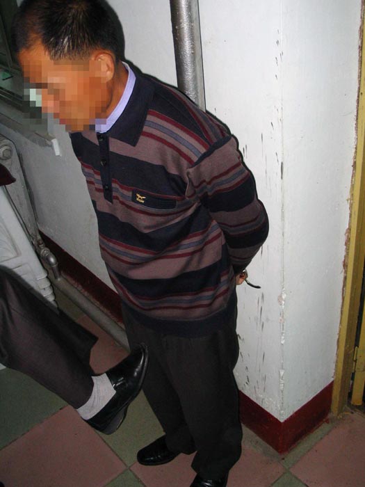 2000年12月23日,我和同修在发真象材料时,被不明真象的人举报,绑架到吉林市长春路派出所。我当晚9点被抓,一直酷刑折磨到第二天3点,有拳打脚踢,扒光衣服推到外面(图2),那年的冬天是近年来最冷的一年。我就大喊:都来看吧,警察就是这样对待法轮功学员的。他们怕恶行让世人知道,就把我拽回来一顿毒打,然后脚踩在身上往身上浇冷水(图3),几个小时的酷刑折磨也没问出一个字,就把我铐在自来水管上猛踢阴部。 (图4)