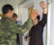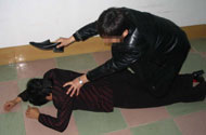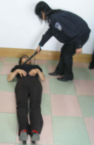 邪悟者杨宝玲、胡艳萍满嘴胡言骂大法、骂师父、逼张俊云写五书。管教唆使犯人宁文芝打张俊云嘴巴,将张俊云按倒在地将裤子扒掉坐在她腿上,用鞋、衣、猛抽。(图6)造成张俊云腿关节拉伤,行走困难,不敢坐椅子,不让睡觉,面对墙站立,至今关节处还有时痛,后张俊云因被迫害严重而被保外就医。