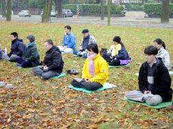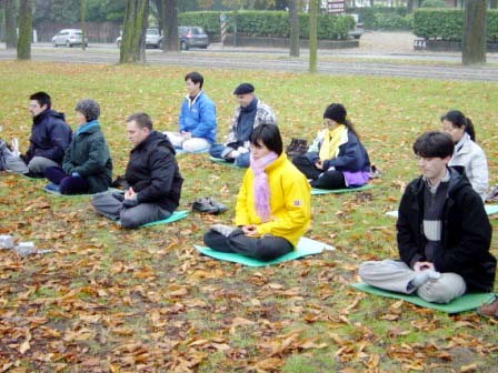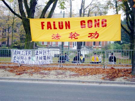 法轮功学员们发正念,炼功。天气较冷,前来维护秩序的警察积极鼓励学员们,并希望有下次再见面的机会。