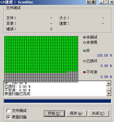 所有的方块最好是全绿(好),说明光盘可以正常读取并使用。黄块(已损坏)说明需要刻录机的纠错功能进行纠错,一般情况也可以正常读取,但可能会导致读取降速。对于我们用低速检测,如果也出现了黄块,光盘的质量就不好了。红块(不可读)说明光盘里有文件无法进行正常操作及拷贝,也就是说刻坏了。