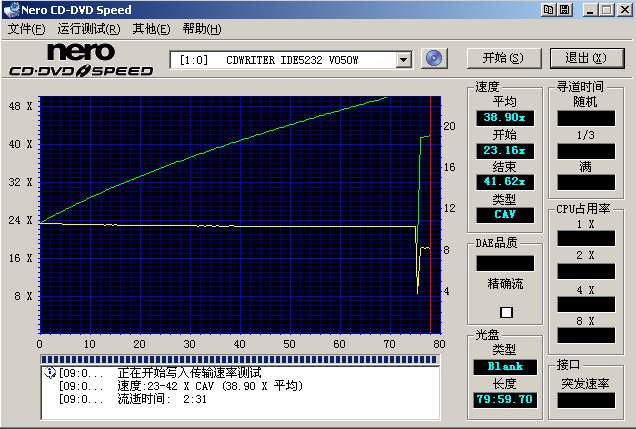 然后把刻录完后的光盘片放入光驱,直接在Nero CD-DVD Speed的主界面下点击“开始”按钮,进行测试(如下图)。