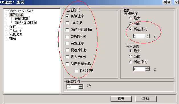 运行主界面的“文件-选项”(图4),在“标准测试”界面中只保留“传输速率”前的勾,其他测试项目前的勾全去掉,这样节省测试时间。“读取速度”可以设置为自己需要的检测速度,对于我们来说,主要测试低速读盘时的质量,那么可以设成8×,注意一定要点上“所选择的”前面的黑点(图5)。
