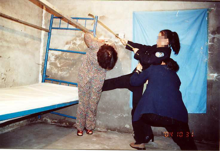 2001年春,哈尔滨万家劳教所十二大队两恶警将坚定修炼的大法弟子踩着头往床底下塞。(图片4)