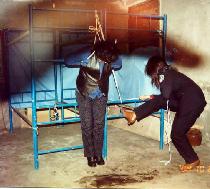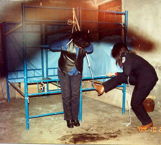 2001年5月25日在万家劳教所男队,我被十二大队女队队长张波等人,用胶带封住嘴,吊在了男队的二层床上(图片2-1、2-2)。还有一次我被吊在男队卫生间上天棚的梯子上一个通宵,痛得汗水湿透了衣服,汗水顺鼻尖流到地上,湿了一大片,后又呕吐,头嗡嗡响。