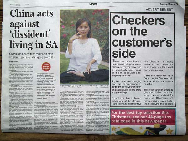 德班技术学院副校长,丹-内卡伊亚纳(Dan Ncayiyana)教授证实本周中国总领事张连云(Zhang Lianyun)曾于两周前在校园中举行的一次会议上提出了这个要求,理由是在德班炼法轮功可能会“引起中国的反感”。