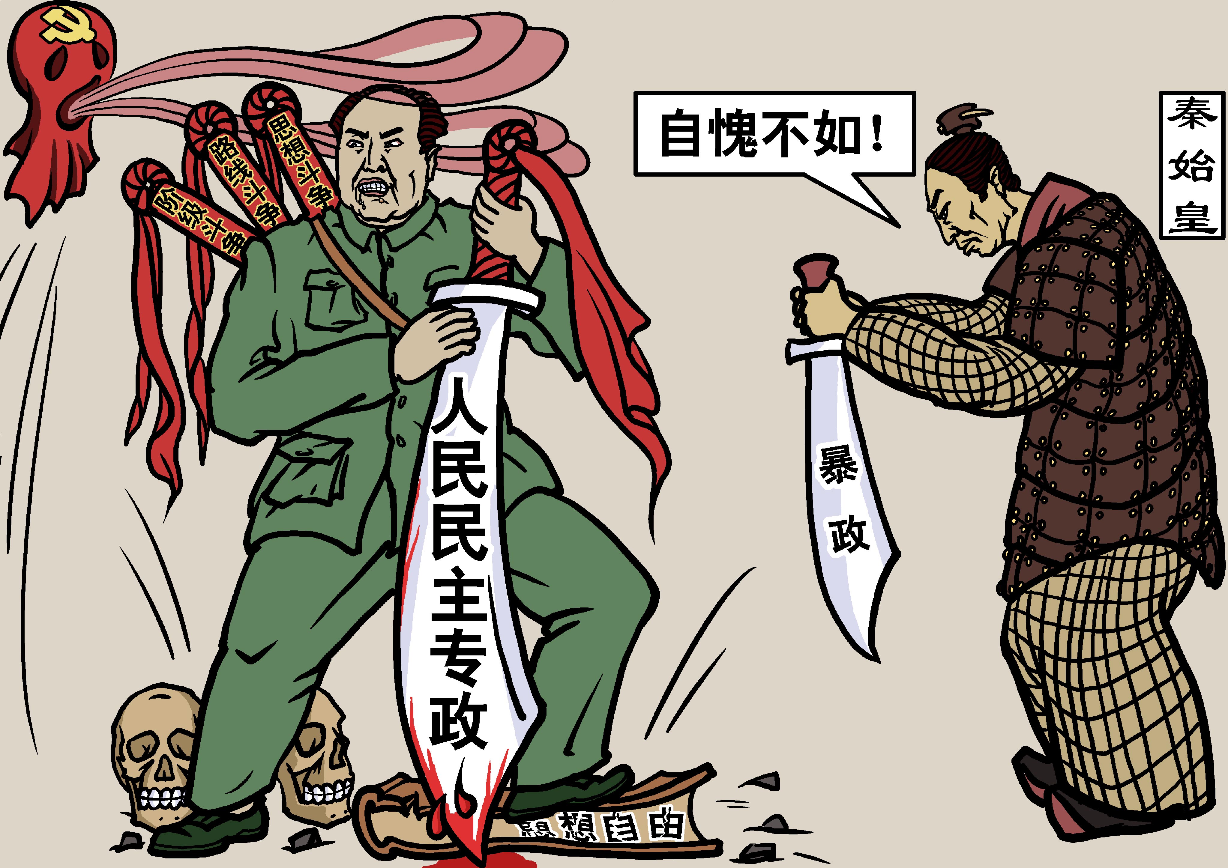 与“狼虎之秦”相比,共产党的暴虐有过之而无不及。人所共知,共产党的哲学是斗争的哲学。共产党的统治也是建立在一系列对内对外的“阶级斗争”、“路线斗争”、“思想斗争”之上。毛泽东自己也曾直言不讳:“秦始皇算什么?他坑了四百六十个儒,我们坑了四万六千个儒。有人骂我们是独裁统治、是秦始皇,我们一概承认,合乎实际。可惜的是,你们说得还不够,还得要我们加以补充。”