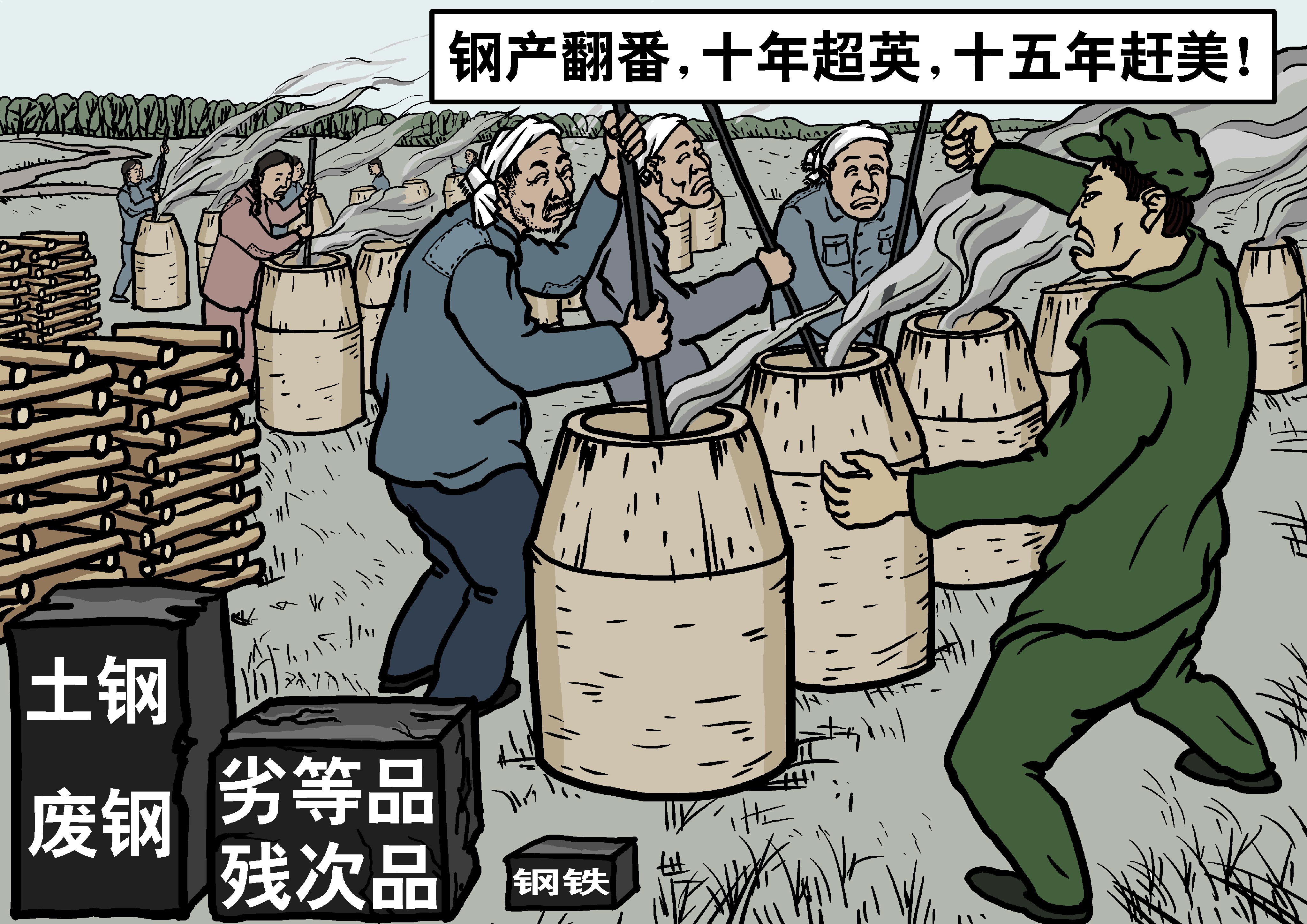 反右之后,中国进入了恐惧事实的状态。听假话、说假话、做假事,逃避事实、歪曲事实成为世风。大跃进便是一次全国集体编造谎言的大爆发。人们在共产党的邪灵引导下,做出了许多荒诞不经的蠢事。说谎者和受骗者同样自欺欺人。在这场谎言与愚行的闹剧中,共产党强制地把它的暴虐邪气植入了全国人民的精神境界。人们高唱着“我就是玉皇,我就是龙王,喝令三山五岭开道,我来了”的跃进歌谣,实施着“亩产万斤,钢产翻番,十年超英,十五年赶美”的荒诞计划,轰轰烈烈,经年不醒。直到大饥荒席卷中国,饿殍遍野、民不聊生。