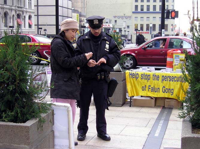 ![]() 曼哈顿警察在听法轮功学员讲迫害真象 | ![]() 曼哈顿警察在签名本上签名支持停止迫害法轮功 |