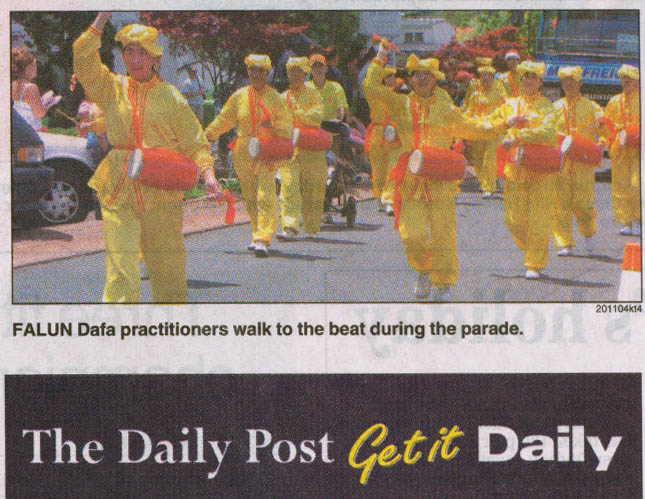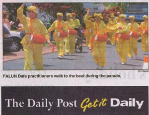 当地的每日邮报(The Daily Post)11月22日刊登了法轮大法学员于游行中行进击鼓。圣诞游行后,当地市政府社区服务官员(Community Service Officer)汤姆贝克先生(Mr. Tom Baker)来函寄上圣诞游行非盈利社团组织类二等奖奖状,信中表示恭贺并祝法轮功学员圣诞及新年快乐。