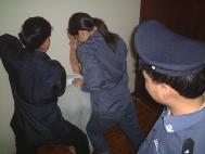 在2001年4月中旬,天津女子劳教所四大队恶警郝德敏(现任所长)命2名诈骗罪服刑恶犯监控我,郝德敏、李小玲等恶警唆使犯人强行给我注射不知什么药,注射后我全身的细胞好像全部脱开一样,神经系统近乎崩溃。以下是模拟当时的场景所拍的照片:(图4)