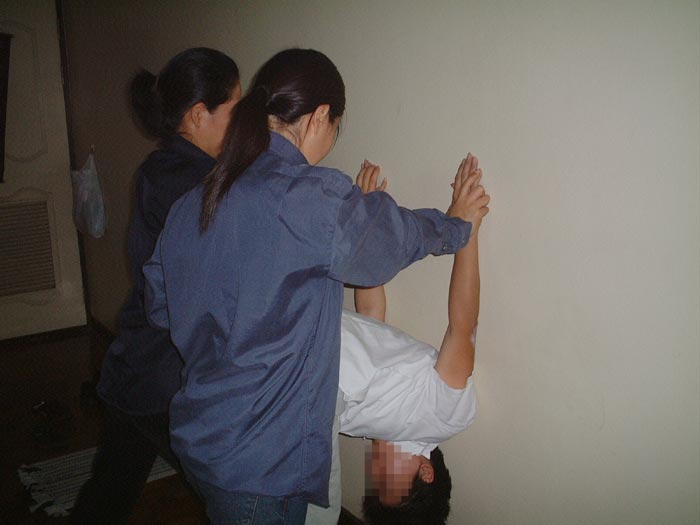我曾三次被非法劫持至天津市红桥区看守所。第一次是1999年10月,我去北京天安门,只为表达一个普通老百姓的心声,被江氏集团的走卒们强行投入天津市红桥分局死号内(大刑期号子),他们强制我背诵监规,因我不背监规被同室几个恶犯毒打,在将近半小时毒打后,我的上半身,除胳膊外均无法动作,且头不住的痉挛似的颤抖。女管教在窗外窥视后,把我调入另一个号。换号后我坚持炼功,被女警拖出毒打。1999年10月底,我第二次被劫持至红桥区看守所,男管教杜建唆使恶犯强行让大法弟子念给造谣的东西,我们都不念,杜建命恶犯数人一起对我们3个大法弟子施以以下酷刑:(图1)