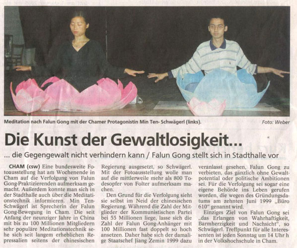 文章说:周末卡姆市的一个全国性的由法轮功修炼者组办的图片展让人们对(法轮功的)迫害引起关注。 此外,人们也可以在市府厅内了解这种打坐功法。敏滕-施为格是法轮功活动在卡姆的负责人。这种90年代初期开始直到受到1亿人欢迎的打坐功法却遭受了来自中国政府方面的镇压,施为格女士这样说到。以图片展的方式,我们希望人们会对(镇压)期间被酷刑折磨致死的1000多名牺牲者予以关注。