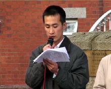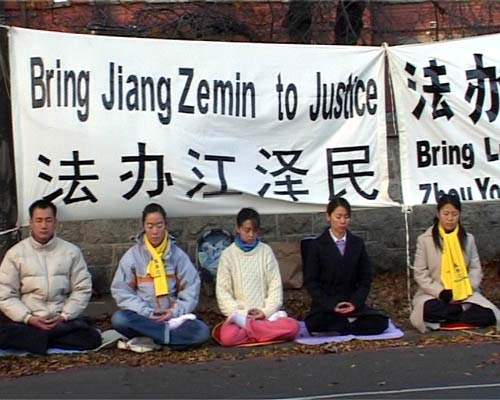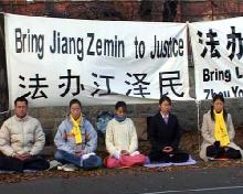 初冬时节的爱尔兰,疾风飒飒。法轮功学员们在寒风中打出了“法办江泽民”和“法办罗干、刘京、周永康”和“支持停止在中国对法轮功的迫害”中英文的横幅,新闻发布会发言人赵明先生宣读了追查迫害法轮功国际组织的公告。宣告了江罗刘周四人在迫害法轮功中的罪行。