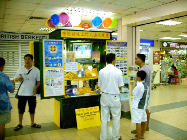 【明慧网2004年11月24日】2004年9月23日至30日期间,马来西亚新山的法轮大法学员在当地的家乐福超级市场租了一个摊位,摆放了洪法展板并向人们介绍法轮大法洪传世界的盛况,同时也摆放大法书籍,并在人多的时候示范功法。